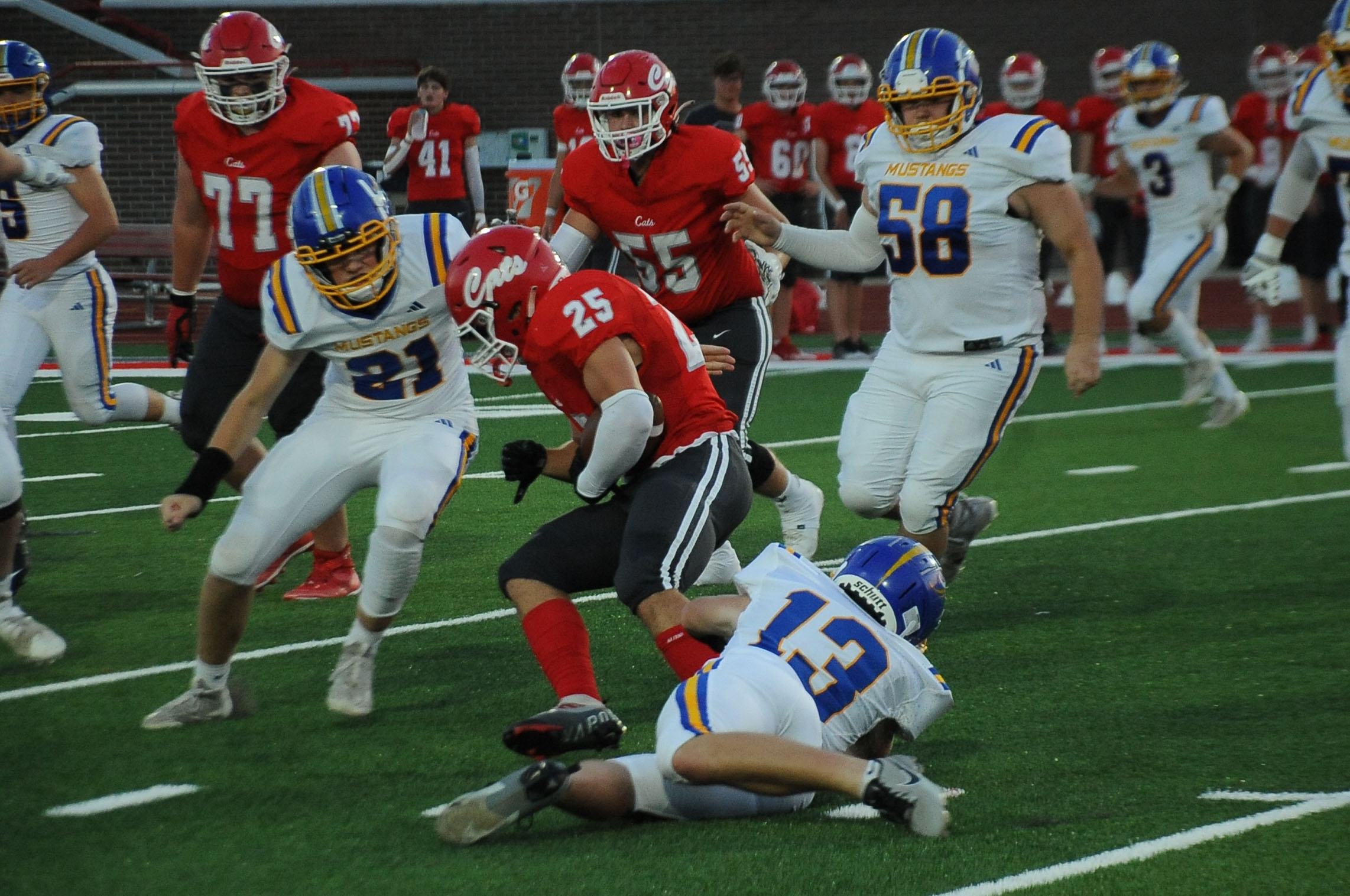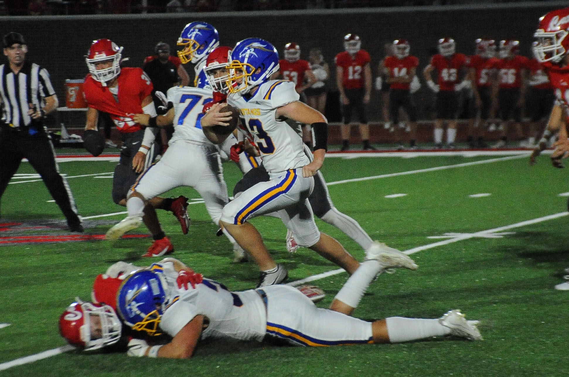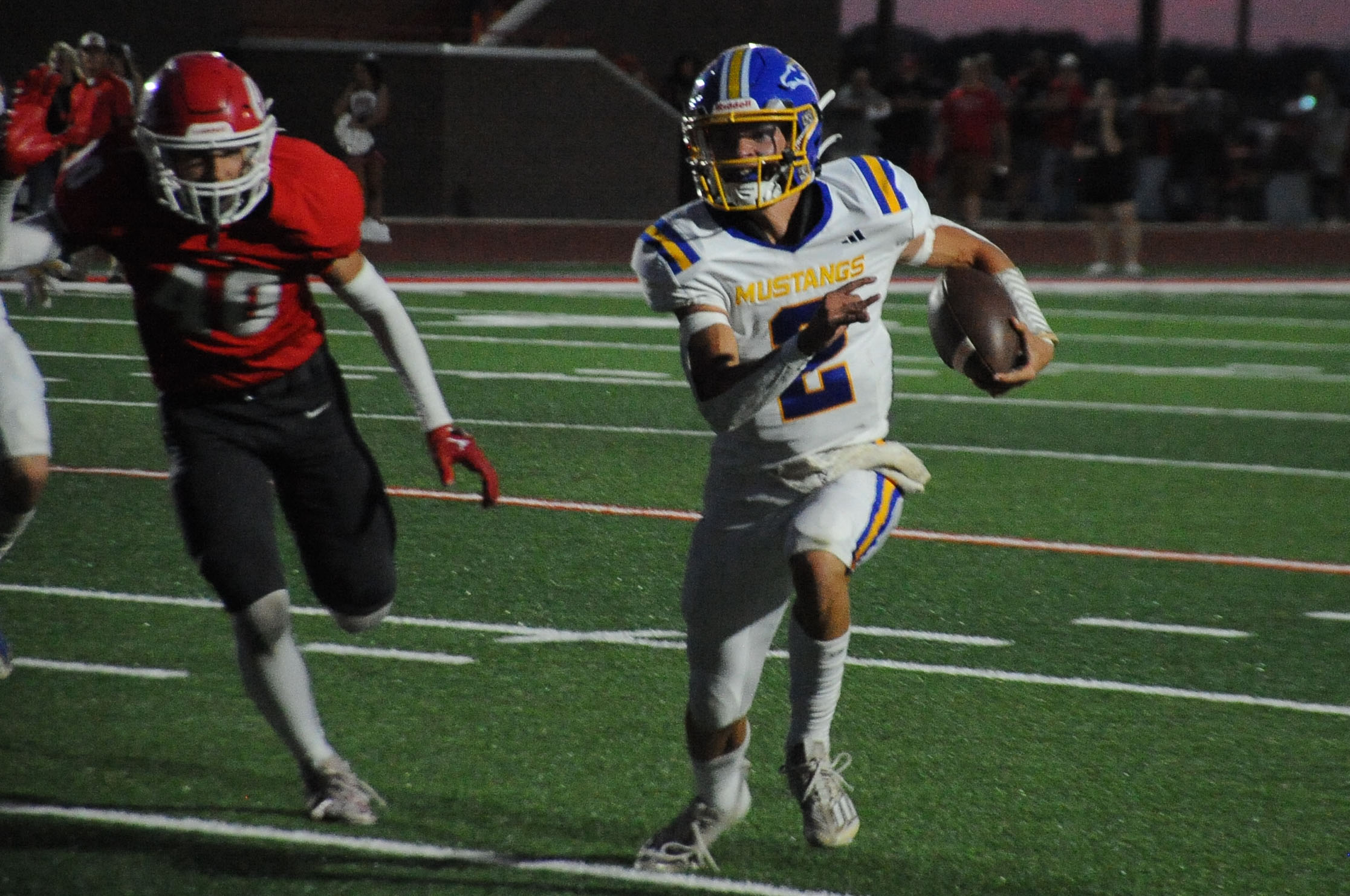 Mustang quarterback Landon Weide, whose electric running proved to be the team’s catalyst for much of the night, seemingly found receiver Korbin Cloud on a long third-down pass to the Wildcat 6.